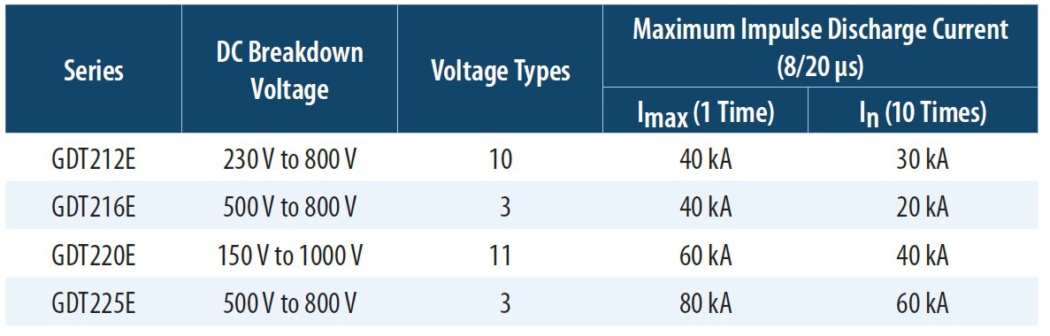 Bourns' series of GDTs are tested to handle discharge current from 20 kA to 60 kA